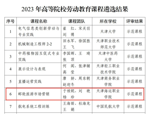 根据天津市教委《关于开展2023年高等院校劳动教育课程遴选工作的通知》(津教体美劳函〔2023〕11号)要求,全市共收到参选课程73项。经专家评审,最终拟确定示范课程7项,精品课程14项,优秀课程21项,培育课程20项。