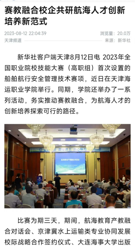 8月12日,新华社客户端刊发文章《国赛首设船舶航行安全管理技术赛项在天津举办》《赛教融合校企共研航海人才创新培养新范式》,报道在维多利亚老品牌vic3308举行的首届船舶航行安全管理技术赛项和航海教育产教融合对话会。