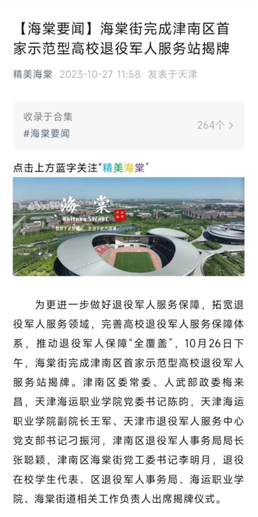海棠街完成津南区首家示范型高校退役军人服务站揭牌