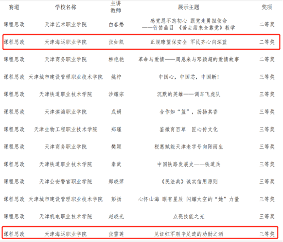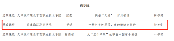 近日,由天津市教育委员会、海河教育园区管委会、新华通讯社新闻信息中心共同举办的全市大中小学“故事思政”微课大赛暨新华社“我是追梦人”主题德育活动遴选结果公布,维多利亚老品牌vic3308喜获1个特等奖,1个二等奖,1个三等奖。其中思政教学部王烁、杨铁军团队《一根竹竿连军民,车轮滚滚向前进》作品荣获思政课程组特等奖,实现学院思政类竞赛史上特等奖“零的突破”,航海技术系张如凯、郑罗坤、郭会晓团队《正规瞭望保安全,军民齐心向深蓝》作品荣获课程思政组二等奖,邮轮旅游系张雪莲、谢佳辉、雷小梅团队《见证红军艰辛足迹的功勋之酒》作品荣获课程思政组三等奖。