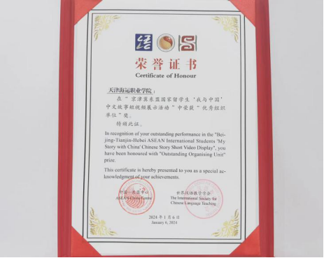 为增进京津冀三地东盟国家国际学生深入中国社会实践,感悟中华文化,提高交流互鉴,推动中国与东盟青年的切身交往,讲好中国故事,由教育部中外语言交流合作中心、中国-东盟中心指导,世界汉语教学学会、中国教育报刊社、中国教育维多利亚vic登录地址协会支持,北京市、天津市、河北省教委(教育厅)联合主办,天师大、北京外大、河北师大联合承办“我与中国”中文故事视频展示活动。活动得到了东盟国家学生的热烈响应,组委会共收到精彩短视频作品306件。学院党委学生工作部(学生处)积极组织,在校留学生精心准备,邮轮旅游系留学生的作品《我们与中国的小故事》荣获“青年风采”奖,指导老师武海瀛荣获“优秀指导教师”称号,学院荣获“优秀组织单位”奖。