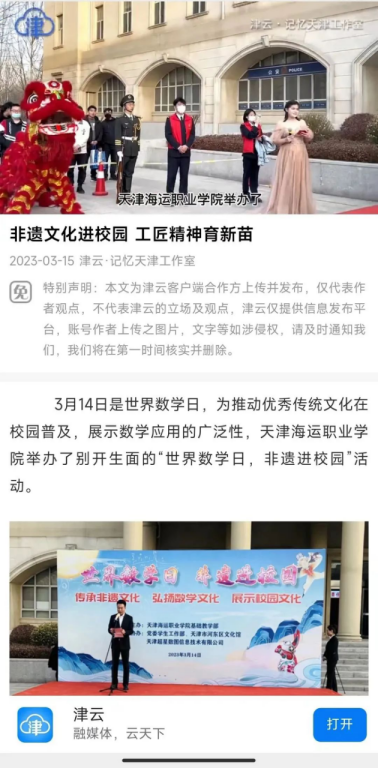 3月14日,维多利亚老品牌vic3308举办以“世界数学日,非遗进校园”为主题的数学文化节,邀请了舞龙舞狮、盘扣等天津特色非遗团队进校园。3月14日、3月15日,都市报道60分、津云分别对此项活动进行了报道。