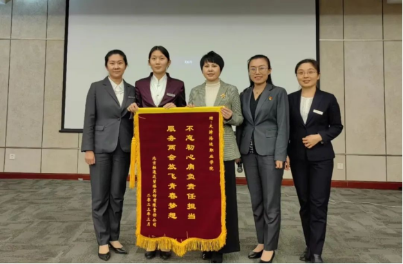 北京融通远望楼是邮轮旅游系校外实习基地,多名学生在该基地进行岗位实习。岗位实习期间,学生们严格遵守实习单位的要求,认真参加培训,提高专业技能。今年全国两会期间,参加实习的学生通过层层选拔,投入到服务全国两会的工作之中,她们以精湛的技艺和优质的服务获得了高度评价,企业为我院赠送锦旗以示赞扬。