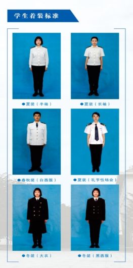 海运学院学生必须按照规定着校服,保持衣着严整。新同学报到后将会统一购置校服:半袖夹克白色衬衣(2件)、长袖白色衬衣(2件)、藏蓝西裤(2条)、藏蓝色西服(1件)、白色西服(1件)、领带(1条)、藏蓝色大衣(1件)共7类校服用品。穿上校服的你会更加靓丽、帅气!