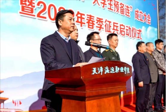 2021年12月2日,学院举行了“‘大学生预备连’成立大会暨2022年春季征兵工作启动仪式”,学院党委书记张建成同志,学院副院长王军同志,津南区人武部征兵办公室主任、军事科科长王毅中校,津南区海棠街人大副主任韩志鹏同志,海棠街退役军人服务站站长胡凡忠同志、学院各系党支部副书记以及大学生预备连成员共计350余人参加了活动。大会由党委学生工作部部长赵雯静同志主持。