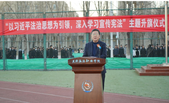 在升旗仪式上,党委书记张建成同志发表了讲话。张书记结合十九届六中全会精神阐述了宪法的重要性,指出作为当代大学生,要坚持以习近平新时代中国特色社会主义思想为指导,全面贯彻党的十九届六中全会精神,大力加强宪法学习宣传,弘扬宪法精神,维护宪法权威,推动宪法全面实施。张书记对同学们提出了学习贯彻执行党的十九届六中全会和宪法的具体要求——学习宪法,领会宪法的精神实质;宣传宪法,以宪法为行为的最高准则 ;自觉遵守宪法,依法行使宪法。全体师生要养成尊法、学法、守法、用法的良好习惯,同一切违宪行为作斗争。