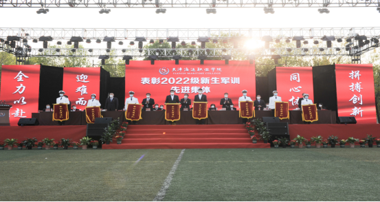 为表彰在军训中取得优异成绩和表现突出的先进集体和优秀个人,学院副院长王明春同志宣读了《关于表彰2022级新生军训先进集体、优秀个人的决定》,2个训练营队、6个训练连队和433名参训学员获得先进集体、优秀个人荣誉称号。学院领导向受表彰的优秀集体及个人颁发了荣誉证书及锦旗,并为2022级新生佩戴了肩章。