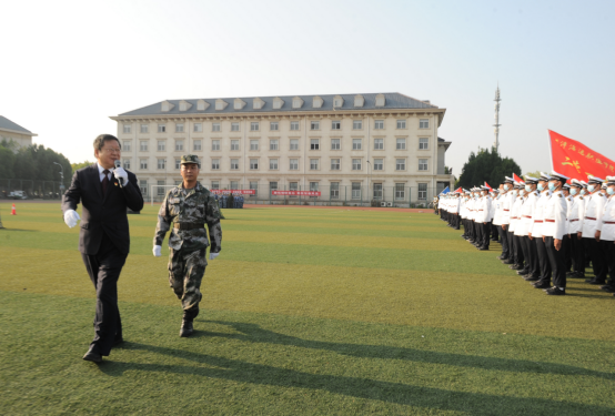 学院党委书记张建成在军训团团长高柏的陪同下检阅了学生军训方队。“老师好!”、“为海运争光!”,响亮的口号展示了我院学子蓬勃朝气和向上精神。