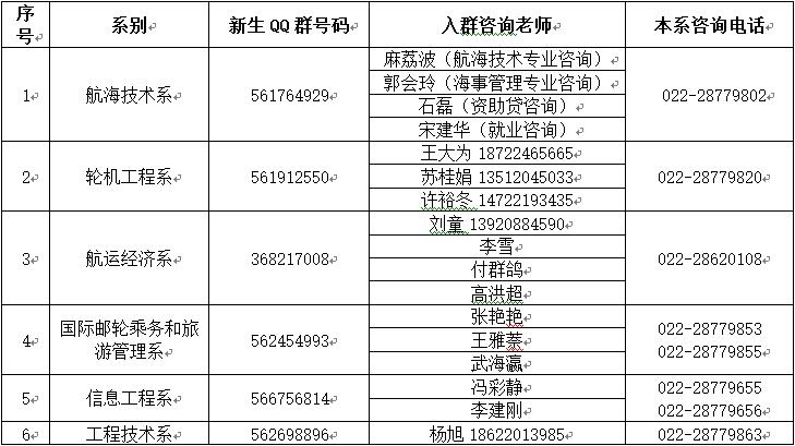 为了做好迎新服务工作,方便各位新生进行各方面问题的咨询,现公布各系的咨询QQ群及其它联系方式。请给位新生抓紧时间入群,本系老师将会对专业学习、就业、奖助贷政策以及报到事宜为大家进行咨询解答。入群时,验证消息务必写明录取专业和姓名,否则将不予批准。学生工作部咨询电话022-28779915,有关减免助学贷等问题可来电咨询。