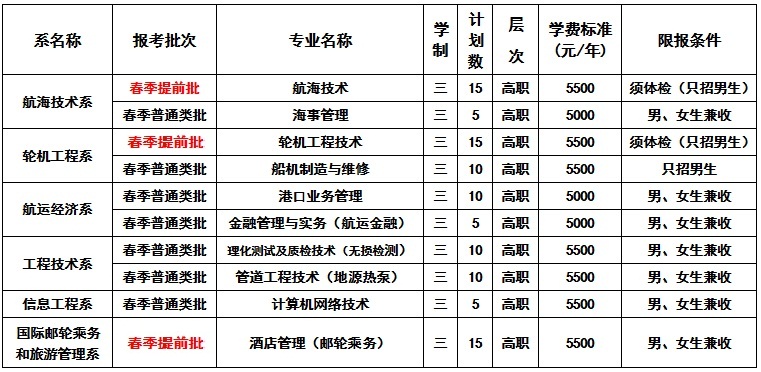 1.《航海技术》、《轮机工程技术》、《船机制造与维修》专业只招收男生(鉴于用人单位对航海类专业毕业生的身体要求,建议报考以上专业考生的肝功能体检结果为正常)