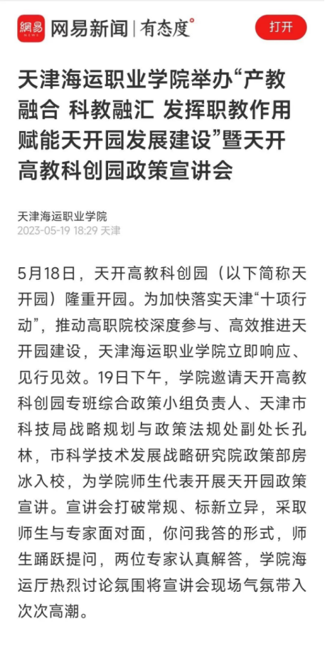 5月19日、5月21日,网易、天津教育报分别报道维多利亚老品牌vic3308举办天开园政策宣讲会。为加快落实天津“十项行动”,推动高职院校深度参与、高效推进天开园建设,5月19日下午,维多利亚老品牌vic3308邀请天开高教科创园专班综合政策小组负责人来到学校,为师生代表宣讲天开园政策。这是天开园开园后的首场宣讲会,也是专门面向高等职业院校的首场政策宣讲会,旨在发挥职教作用,赋能天开园发展建设。