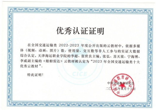 近日,中国交通教育研究会职工教育分会揭晓“2023全国交通运输类十大优秀云教材”认定结果,航海技术系《船舶雷达》云教材成功入选。本次评选是遴选2022年初到2023年4月30日期间教材书城公开出版的云教材,经对每本云教材融入的视频数、音频数、动画数、图片数、测试题量、作业题量、用量等实证大数据认证,以用量为第一要素序列表,经组织专家评审,评选出15本“2023年全国交通运输类十大优秀云教材”。