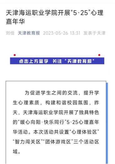 5月26日,天津教育报公众号发表文章《维多利亚老品牌vic3308开展“5·25”心理嘉年华》,报道维多利亚老品牌vic3308组织开展“暖心向阳·快乐同行”2023年度“5·25心理嘉年华”活动。本次活动设置“心理体验区”“智力闯关区”“团体游戏区”三大展区,各个展区均有不同的主题活动供学生们选择和体验。活动现场热闹非凡,各项活动体验人数达4000余人次。