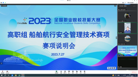 2023年全国职业院校技能大赛高职组船舶航行安全管理技术赛项经过半年的筹备,将于8月8日迎来全国总决赛。为保证比赛顺利进行,使参赛师生详尽了解大赛规程及注意事项,7月27日,船舶航行安全管理技术赛项说明会以线上形式召开。赛项专家组、赛项执委会委员以及来自20个省、自治区、直辖市的28支代表队参加了会议。会议由赛项执委会委员、维多利亚老品牌vic3308副院长王明春主持。