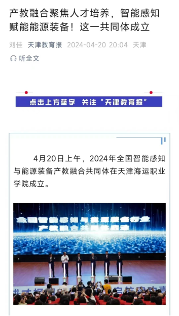 4月20日,全国智能感知与能源装备行业产教融合共同体成立大会在我院召开,天津教育报微信公众号发表文章《产教融合聚焦人才培养,智能感知赋能能源装备!这一共同体成立》,对全国智能感知与能源装备行业产教融合共同体成立大会进行了详细报道。