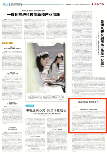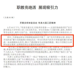 5月17日,《天津教育报》头版刊发文章《职教亮绝活 展现吸引力——天津职业教育活动周精彩纷呈》,报道今年职业教育活动周期间,我市中高职业院校特色亮点活动,其中介绍了邮轮旅游系举办的“花开四季皆应景,具是巧手而折成”餐巾花技能展示体验活动。
