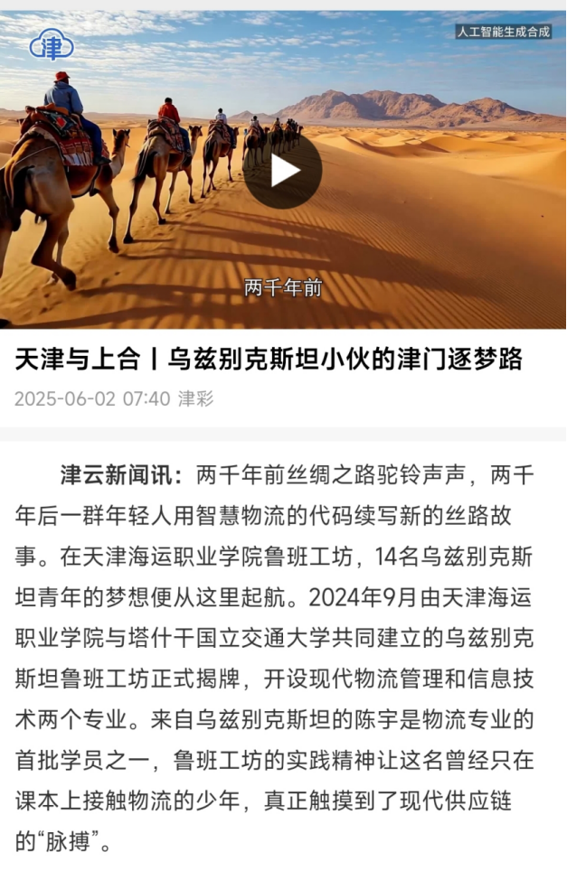 日前,津云客户端发表文章《天津与上合|乌兹别克斯坦小伙的津门逐梦路》,报道由我院与塔什干国立交通大学共同建立的乌兹别克斯坦鲁班工坊。
