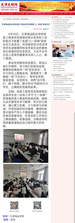 6月30日,天津文明网宣传我院信息工程系党支部组织党员和入党积极分子观看“七一勋章”颁授仪式。