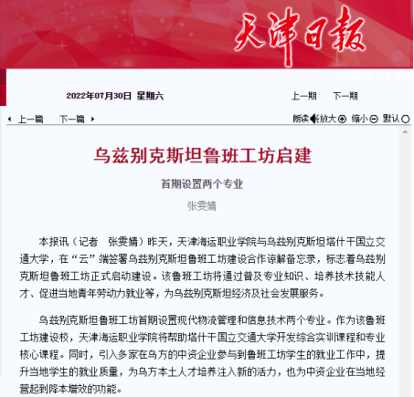 7月30日,《天津日报》刊发文章《乌兹别克斯坦鲁班工坊启建 》。文章详细报道了我院与乌兹别克斯坦塔什干国立交通大学,在“云”端签署乌兹别克斯坦鲁班工坊建设合作谅解备忘录,正式启动建设乌兹别克斯坦鲁班工坊。该鲁班工坊首期设置现代物流管理和信息技术两个专业,将通过普及专业知识、培养技术技能人才、促进当地青年劳动力就业等,服务于乌兹别克斯坦经济及社会发展。