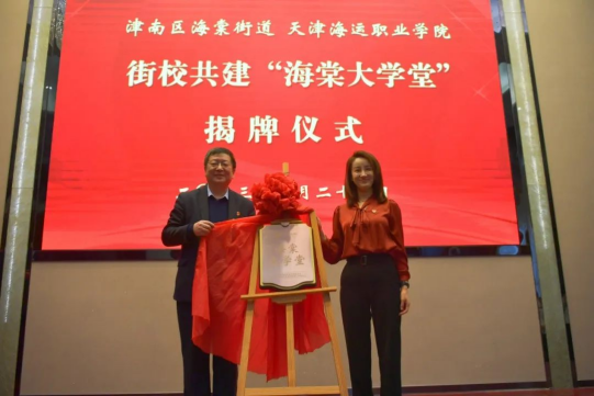 会前,与会领导参观了学院航海实训模拟器及天象馆。会上,街校双方领导签署共建协议,并为“海棠大学堂”揭牌。