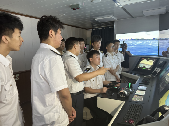 登船后,同学们参观了驾驶台、主甲板、船上厨房、生活区域等,更好地熟悉今后的工作环境。驾驶台部分是此次学习的重点。驾驶认知由船长带领大家熟悉设备布置,讲解设备参数、各大系统的工作原理及平时值班的注意事项。同学们通过模拟驾驶更深一步了解了航海的魅力。