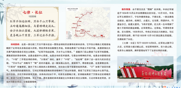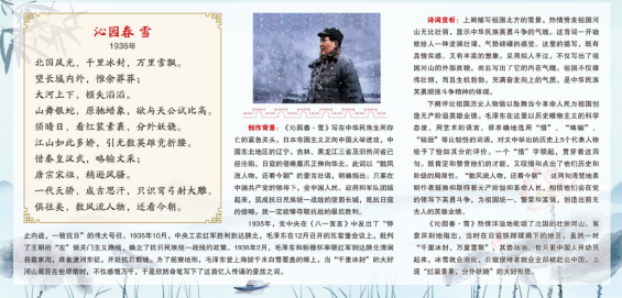 本次展览以纪念毛泽东同志诞辰130周年为契机,展板以图文并茂的方式展出毛泽东同志在不同时期写就的《水调歌头·重上井冈山》《沁园春·雪》《沁园春·长沙》《七律·长征》《忆秦娥·娄山关》等九首经典诗词,每首诗词包含了诗词原作、写作背景和解读赏析三部分内容,使读者能够穿过历史的时空,重温波澜壮阔的峥嵘岁月,领略毛泽东同志的诗人风采和人格魅力,感悟蕴含于字句中的革命豪情,铭记伟大领袖的丰功伟绩,汲取永远向前的精神动力。