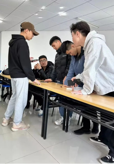 学生们课间探讨短视频拍摄策划方案,找竞店,