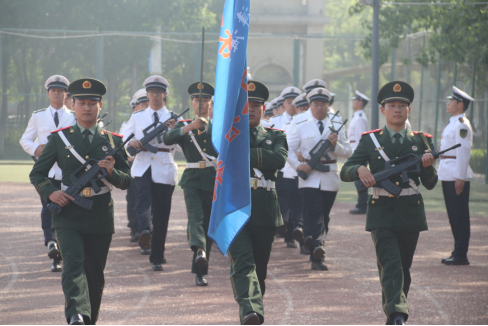 7点40分,升旗仪式正式开始。轮机工程系国旗护卫队英姿飒爽地迈着整齐的步伐、喊着响亮的口号护送旗帜走向国旗台。伴随着雄壮激昂的国歌,鲜艳的五星红旗冉冉升起,全体师生行注目礼。