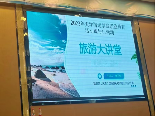 在旅游大讲堂活动中,来自胜景游(天津)国际旅行社有限公司的袁子樾总经理从自身从业经历谈起,向同学们分享了对旅游行业改革转型创新的观点,帮助同学们树立职业自信,给予同学们很多宝贵建议。优秀毕业生赵冉冉与同学们进行了良好互动,勉励学弟学妹们在实践中提升职业技能和就业竞争力。