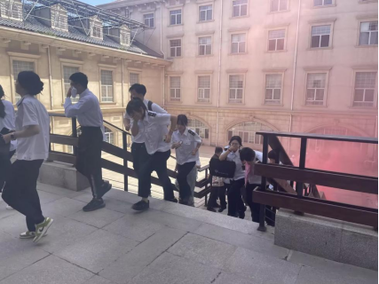随着烟片的燃烧和火警警报的响起,正在实训室内上课的师生,迅速进入紧急疏散状态。在实训课老师的组织下,同学们用衣服捂住口鼻,按照逃生路线,迅速有序地撤离到海邮酒店外的空旷地。