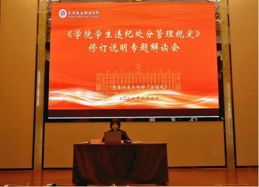 党委学生工作部部长王洋对学院学生违纪处分管理规定修订情况进行了宣讲解读,就贯彻落实新《规定》作了专题辅导。她强调,要从推进学院依法治校、保障学院高质量发展大局出发,充分认识学习宣传贯彻新《规定》既是贯彻依法治校、严管厚爱,落实立德树人根本任务,规范学生行为的重要手段,也是加强对学生思想政治教育,促进学生实行自我教育、自我管理的有力措施,要以高度的责任感和使命感,积极主动做好新《规定》的学习宣传贯彻工作;要营造浓厚的学习、宣传、贯彻氛围,教育引导学生增强纪律意识、法治意识和安全意识,提升学生遵纪守法和安全防范的自觉性,以实际行动共护共建共享安全和谐的海运校园;要紧密结合教学系学生工作实际,建立学生关怀教育帮扶机制,形成家校共育合力,护航学生身心健康、成长成才。