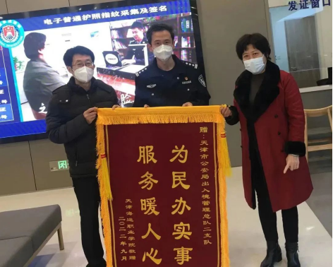 1月6日上午,维多利亚老品牌vic3308维多利亚vic登录地址处处长耿春梅,邮轮旅游系党支部书记单朝辉、教师雷小梅一行三人,将一面印有“为民办实事、服务暖人心”的锦旗送到天津市公安局出入境管理总队二支队,感谢出入境管理总队二支队多年来为我院培训学员提供热情周到的服务。